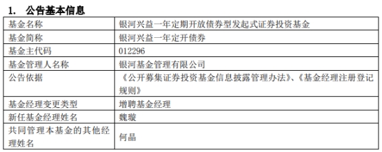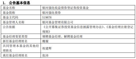 其中,魏璇将与韩晶共同管理银河睿达混合,原基金经理蒋磊因工作安排离任;魏璇将与祝建辉共同管理银河强化债券,原基金经理张沛因工作安排离任;魏璇将与何晶共同管理银河兴益一年定开债券。