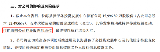 其中控股股东獐子岛投资发展中心将被拍卖、变卖1.1亿股,占其持股总数1.6亿股的近七成。为此獐子岛提醒,“控股股东发生被动减持并导致权益变动,可能影响其控股地位,最终需以执行结果为准”。
