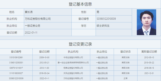 网传黄长清新任万和证券副总裁,目前证券业协会和官网未见公开信息。