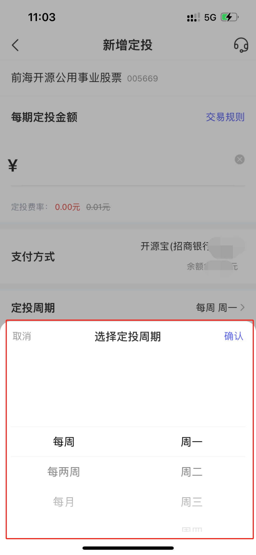 定投周期有多种可选,设置完成后,点击“确认”,定投计划设置成功;