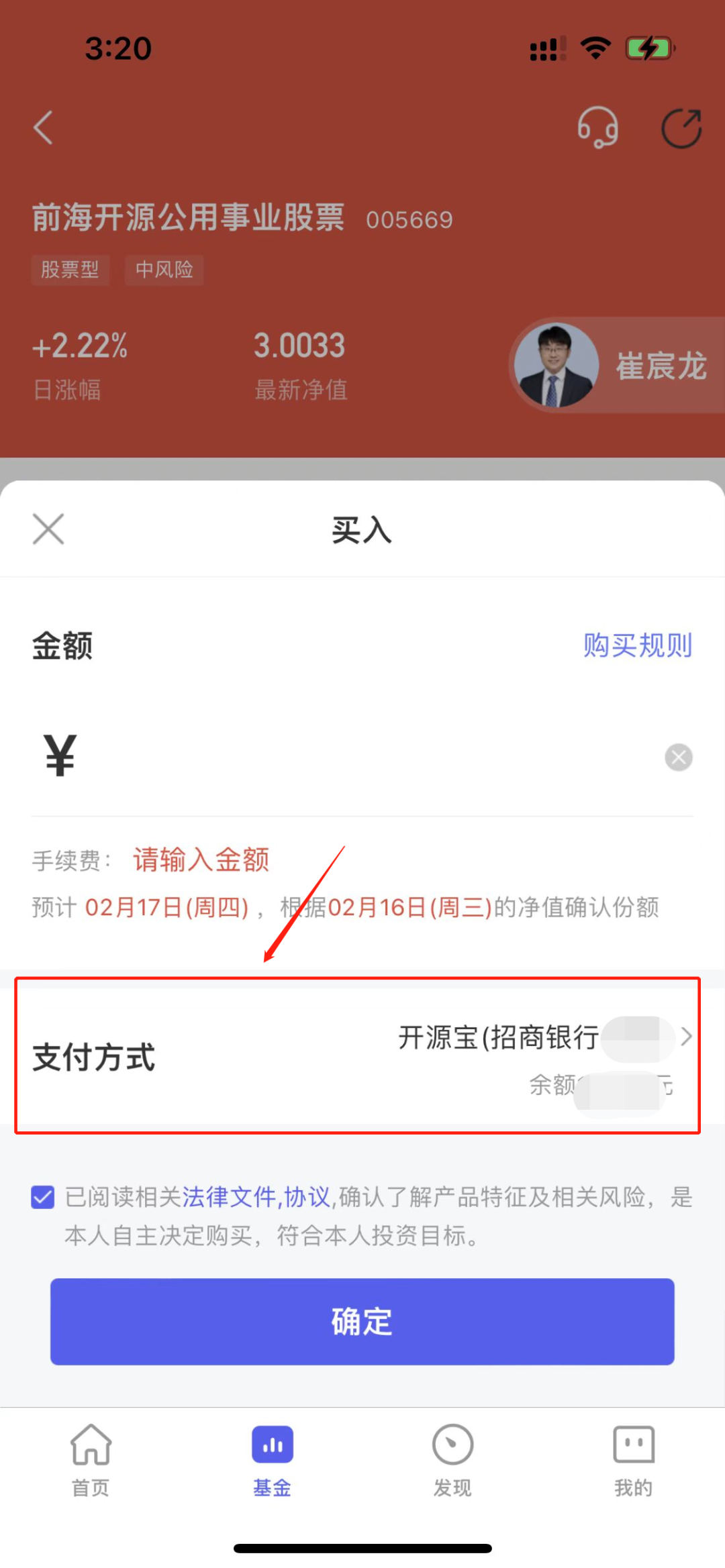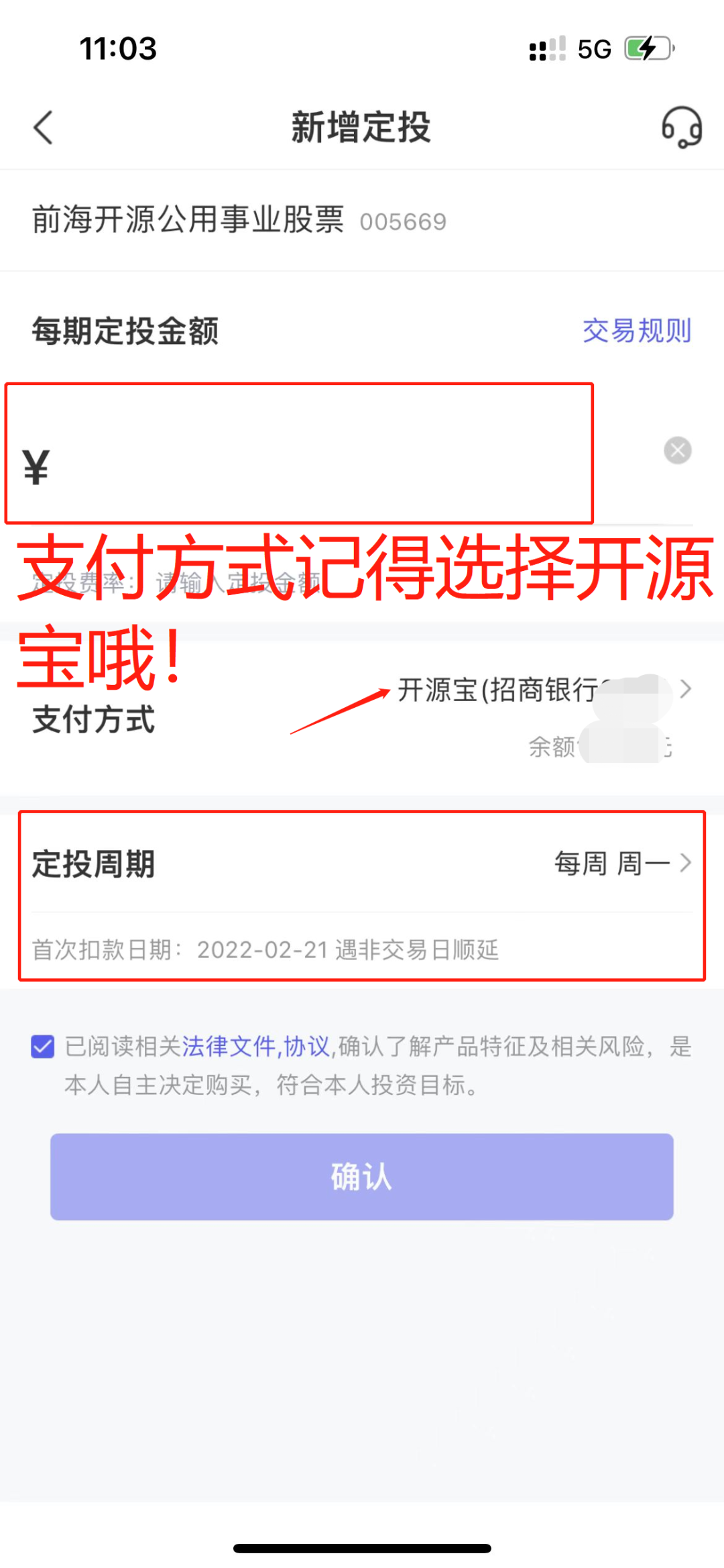 申购界面,输入申购金额后,在支付方式处选择“开源宝”;