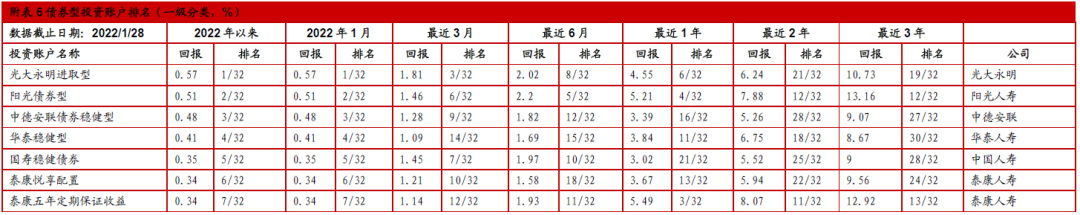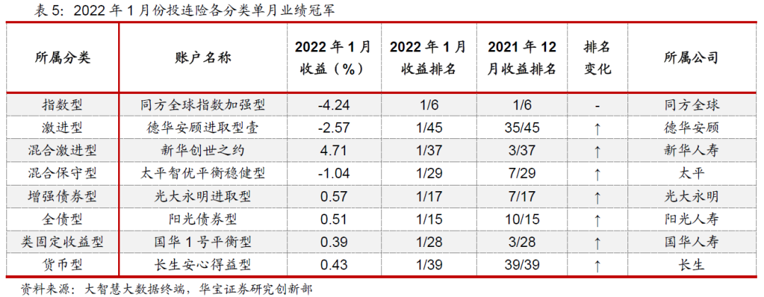 2022年1月份纳入统计的216个投连账户中有71个取得正收益,占比32.87%。收益率名列前列账户包括:新华创世之约(4.71%)、光大永明人寿进取型(0.57%)、阳光人寿债券型(0.51%)、中德安联债券稳健型(0.48%)和长生人寿安心得益型(0.43%)。2022年1月份投连险各分类账户单月业绩冠军如下表。