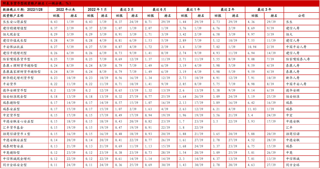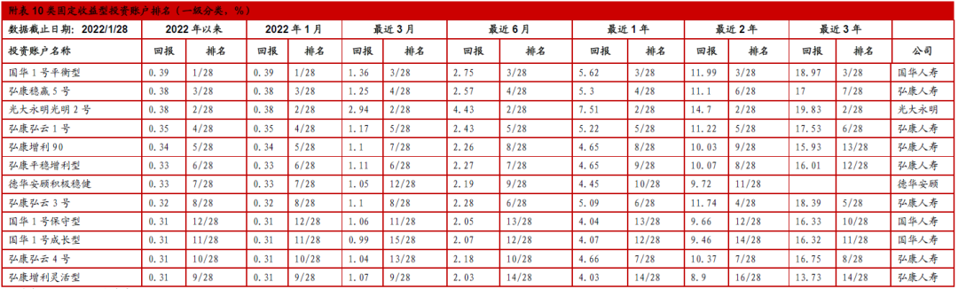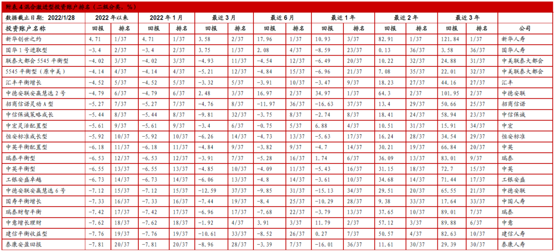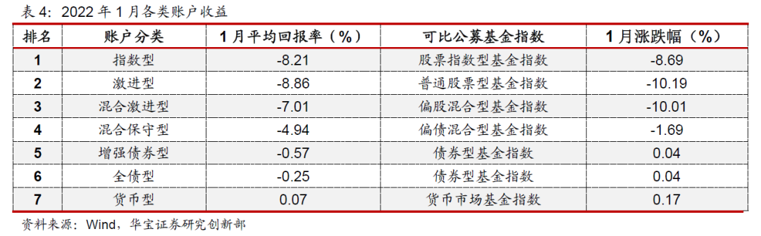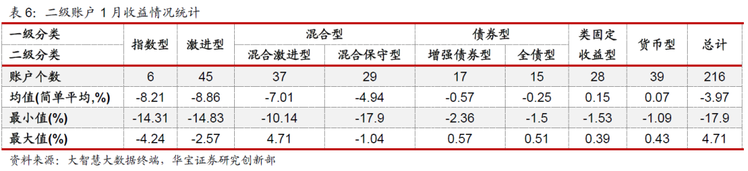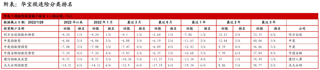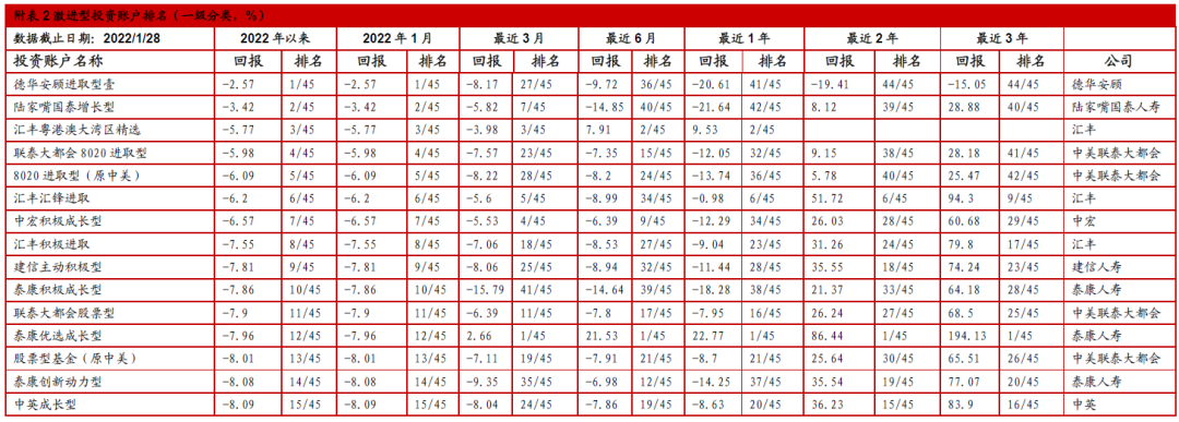 2022年1月排名体系内账户共216个,全月投连险账户单月平均收益-3.97%。