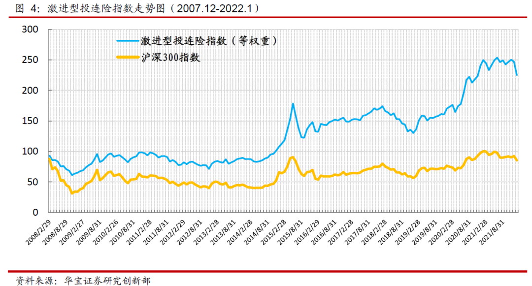 我们将激进型投连险月度平均收益率做等权重加权制作出激进型投连险指数,并将其与沪深300指数做对比,1月份权益市场普遍下行,全月激进型投连险指数收益率-8.86%,沪深300指数收益率为-7.62%,截止至2022年1月底,激进型投连险指数收于225.20点,调整后的可比沪深300指数收于85.49点。