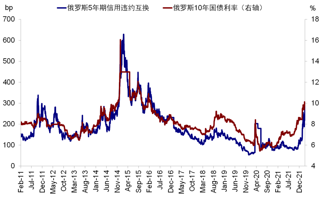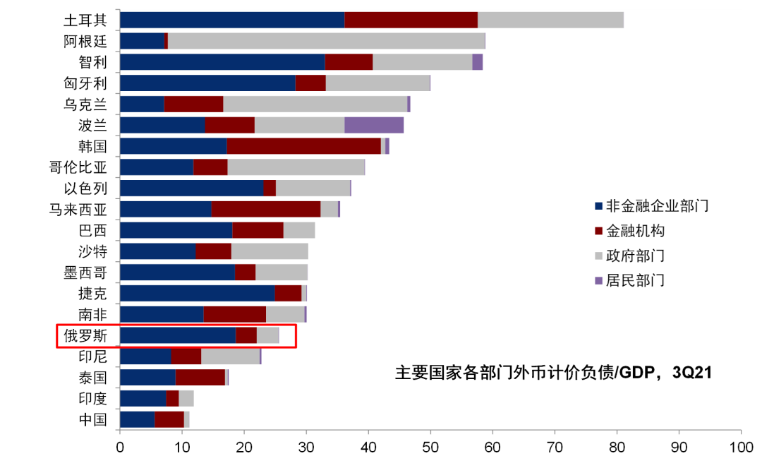 3)金融资产、外债和汇率的风险敞口。潜在的金融和出口制裁也会影响俄罗斯的财政收入,进而影响其汇率和外债偿付能力。截至2021年三季度,俄罗斯各部门整体外币计价负债占GDP比例为25%(非金融企业部门占比19%)。如若潜在的制裁出现,可能会导致俄罗斯经常账户顺差收窄,进而影响汇率走势和俄罗斯对外融资能力、甚至导致偿付风险。年初以来,伴随俄乌局势的持续升级,俄罗斯卢比兑美元贬值超过3%,俄罗斯主权债务CDS也跳升~60bp至2014年以来新高。