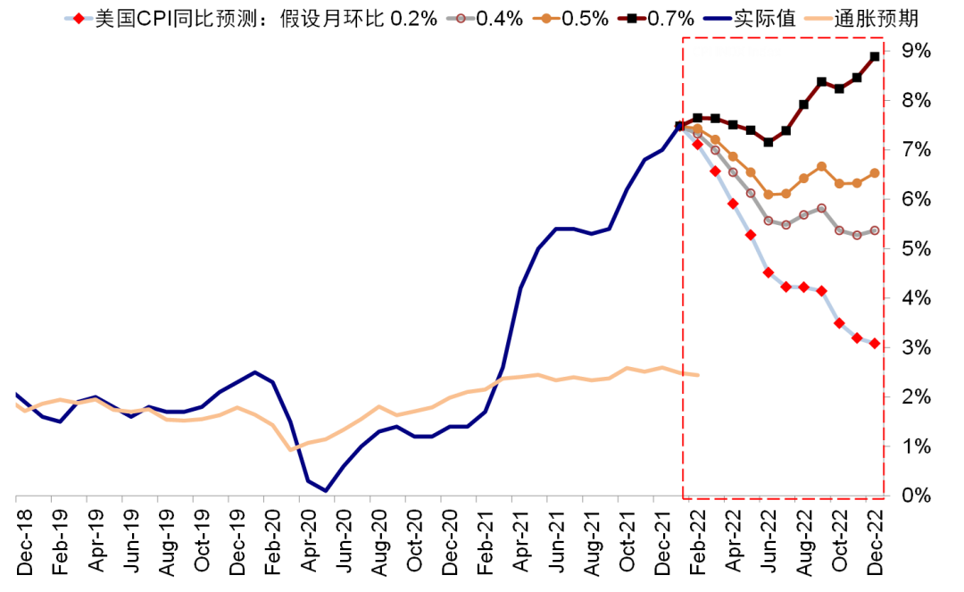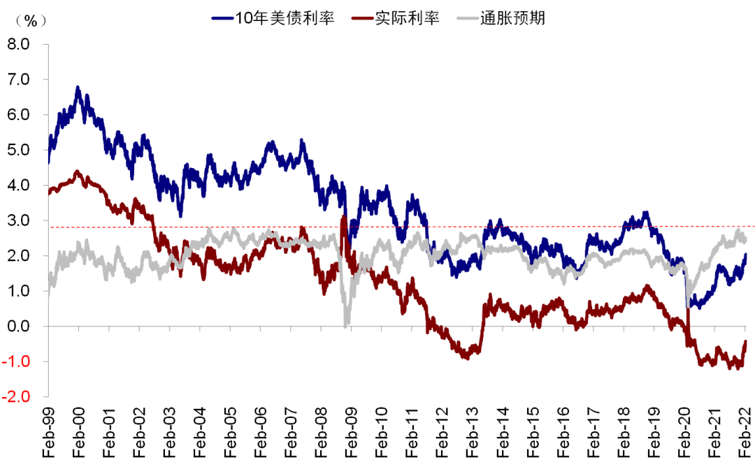 1)原油价格供应溢价。目前油价受供应溢价担心已经上冲至97美元。根据中金大宗商品组的测算,如果地缘风险演变为实际的供应冲击并假设俄罗斯石油供给减少200万桶/天以上,油价可能因此出现30美元/桶的供应溢价,摸高120美元/桶。从历史关系来看,油价与整体通胀有较高相关性,尤其是CPI中的能源价格更是高度同步(1990年以来相关性系数达93%)。我们测算,若油价上冲而其他价格保持不变或额外抬升美国CPI月环比0.1个百分点,这无疑会加大市场对于美联储紧缩的担忧。与此同时,由于油价与债券利率中的通胀预期(breakeven)也高度相关但存在2.7~2.8%的长沿,因此在当前水平(~2.4%)也可能由此带来长端美债利率的上行压力。