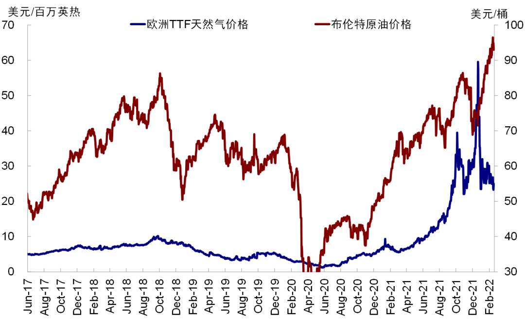 2)北溪2号或进一步加重欧洲能源市场短缺。欧盟已经表示也要支持乌克兰,并可能施加制裁。欧俄关系的变数也可能会因此影响后续北溪2号的进展(北溪2号已于2021年9月建设完毕,但尚未投入使用,目前仍在等待德国和欧洲相关部门审批)。这在欧洲天然气供应依赖度较高,而此前一度气价飙升的背景下,如果后续局势紧张,也会加大短缺格局。