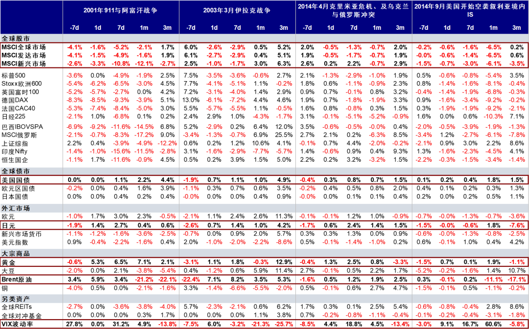 从一般的规律来看,除非是爆发更大规模和波及更广泛的冲突,局部冲突对主要资产的影响不会特别显著且持续时间也相对比较短暂,往往是脉冲式的,并不会完全改变原有趋势。我们梳理的90年代以来的案例中,除了2001年911事件是因为美国直接受到袭击所以引发了更大范围内的恐慌(发达股市平均下跌~5%、新兴市场跌幅高达~10%)且对市场的影响时间也更长外,其他几次的影响时间都是以周度计,市场在此期间的跌幅通常在5%左右。