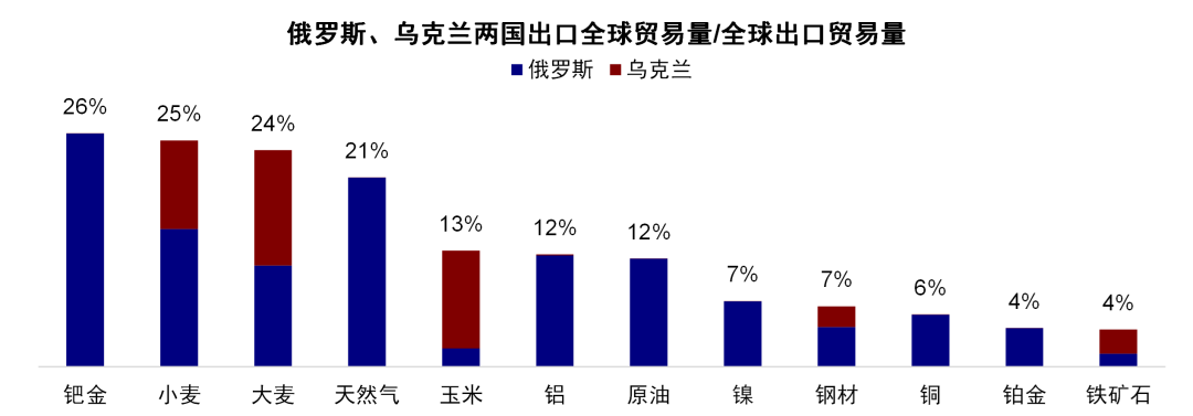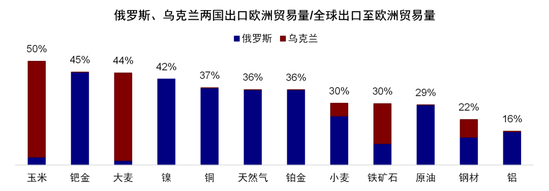 不过,相比单纯因为风险偏好造成的避险交易,我们认为后续如果因为一些制裁导致的连锁反应和连带损失更加值得关注,主要是考虑到此次俄乌在全球部分资源品定价中的特殊性。截至2021年,全球每天约9800万桶的产量中,俄罗斯占比高达11%,1090万桶/天,俄罗斯贡献了全球油、气出口总量的12%和21%;欧洲对俄罗斯的油气供给依赖度更高,2021年俄罗斯出口欧洲油气贸易量占全球出口至欧洲贸易量的29%和36%,俄罗斯向欧洲输送的管道气约占欧洲天然气总进口量的35%。其影响和传导路径主要体现在以下几个方面,