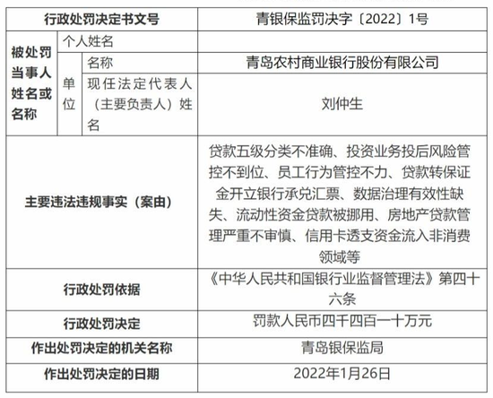 据银保监会官网2022年1月28日发布的信息,1月26日,青岛银保监局对青农商行作出罚款4410万元的行政处罚决定,主要违法违规事实(案由)包括:贷款五级分类不准确、投资业务投后风险管控不到位、员工行为管控不力、贷款转保证金开立银行承兑汇票、数据治理有效性缺失、流动性资金贷款被挪用、房地产贷款管理严重不审慎、信用卡透支资金流入非消费领域等。