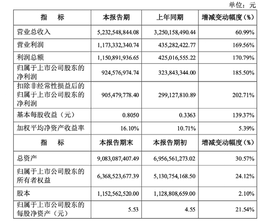 当日,雅化集团还披露了2021年业绩快报,公司2021年实现营业总收入52.33亿元,同比增长60.99%;实现归母净利润9.25亿元,同比增长185.5%;扣除非经常性损益后的归属于上市公司股东的净利润9.05亿元,同比增长202.71%;基本每股收益0.8050元。