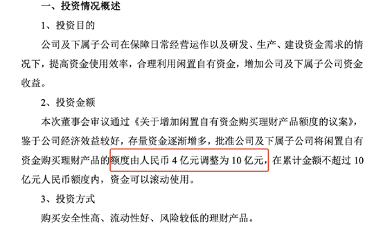 昨晚,雅化集团公告表示,经董事会审议通过《关于增加闲置自有资金购买理财产品额度的议案》,鉴于公司经济效益较好,存量资金逐渐增多,批准公司及下属子公司将闲置自有资金购买理财产品的额度由人民币4亿元调整为10亿元,在累计金额不超过10亿元人民币额度内,资金可以滚动使用。将投资安全性高、流动性好、风险较低的理财产品。