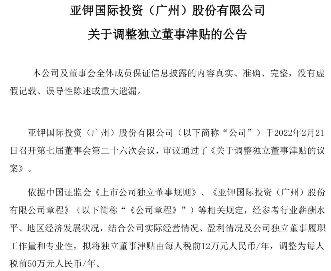 为了调动独立董事工作的积极性,亚钾国际大手一挥,给公司3名独董的薪资足足上调了3倍多。