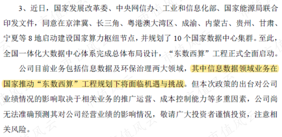 但这份公告显然意不在此,因为依米康还另外表示:其信息数据领域业务在国家推动“东数西算”工程规划下,将面临机遇与挑战。