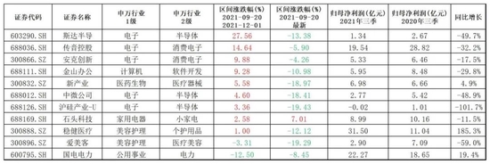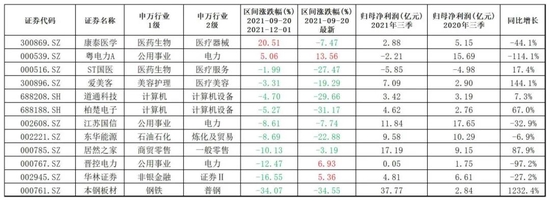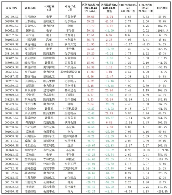 下面表格选取了富时罗素8月份纳入指数的个股,同时统计了2021年第三季度的表现及业绩情况(2021年9月22日-12月1日,A股上证指数微跌1.03%,9月22-2月17日,下跌4.04%);