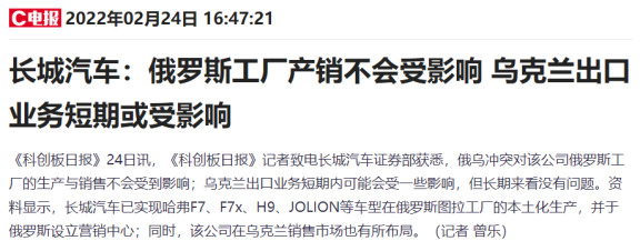 长城汽车:俄罗斯工厂产销不会受影响 乌克兰出口业务短期或受影响