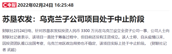 苏垦农发:乌克兰子公司项目处于中止阶段