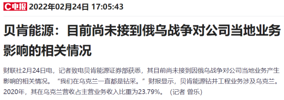 贝肯能源:目前尚未接到俄乌战争对公司当地业务影响的相关情况