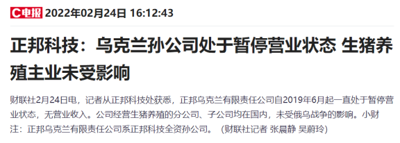 正邦科技:乌克兰孙公司处于暂停营业状态 生猪养殖主业未受影响