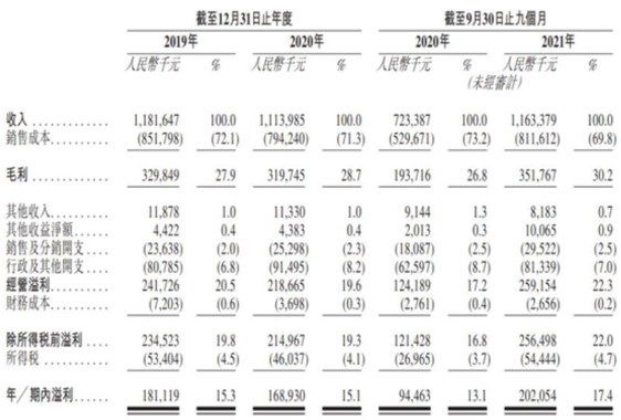 财务数据方面,招股书显示,2019年、2020年及2021年前九个月,杨国福收入分别为11.82亿元、11.14亿元和11.63亿元,同期利润分别为1.81亿元、1.69亿元和2.02亿元。
