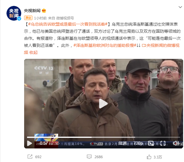 乌克兰总统泽连斯基通过社交媒体表示,他已与美国总统拜登进行了通话,双方讨论了乌克兰局势以及双方在国防等领域的合作。有报道称,泽连斯基在与欧盟领导人的视频通话中表示,这“可能是他最后一次被人看到还活着”。