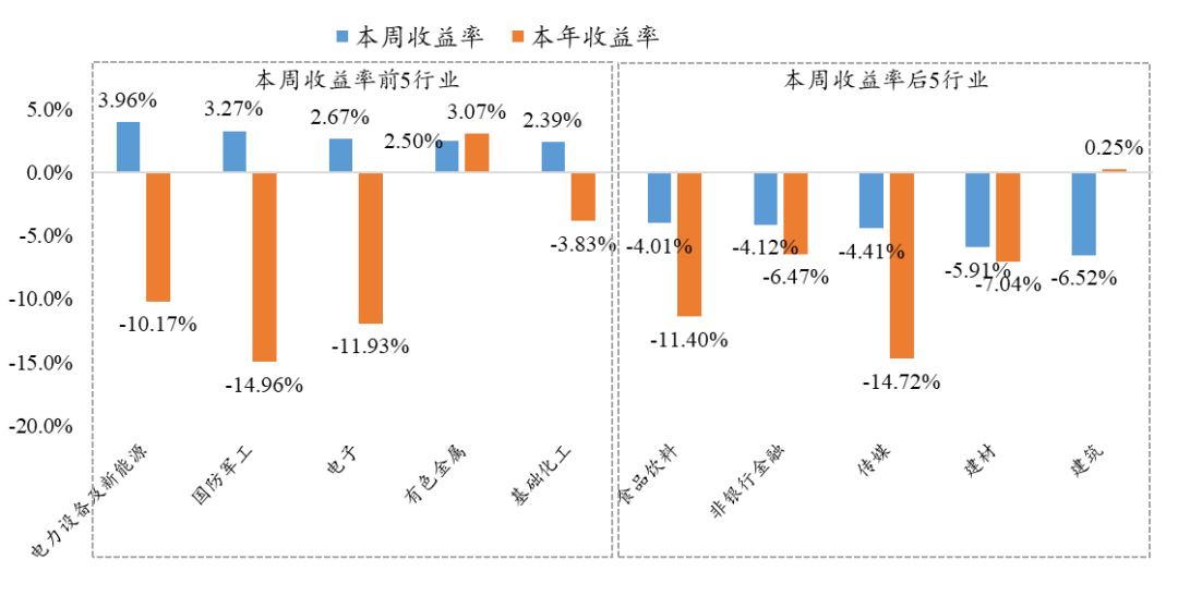 本周涨幅居前的行业为电力设备及新能源、国防军工、电子、有色金属、基础化工,本周收益率分别达3.96%、3.27%、2.67%、2.50%、2.39%。食品饮料、非银行金融、传媒、建材、建筑为本周收益排名靠后的行业。