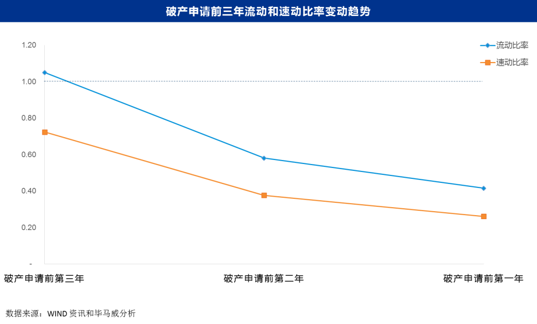 以近年来申请破产的部分上市企业为例,虽然其所处行业不同会导致流动比率和速动比率的绝对值有所差别,但从这些企业的平均流动比率及速动比率来看,在破产申请前的三年均呈现出明显的下降趋势。尤其是从破产申请前第二年开始,这些企业的平均流动比率大多都会跌至1以下,即呈现出流动资产小于流动负债的情形。