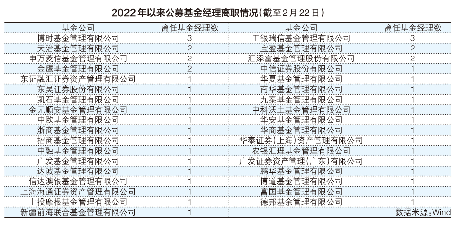 Wind数据显示,截至2022年2月22日,开年不到2个月,公募基金经理离职人数已达到了44人,涉及35家基金公司。其中,博时和工银瑞信均有3位基金经理离职,宝盈基金等5家基金公司均有两人离任。