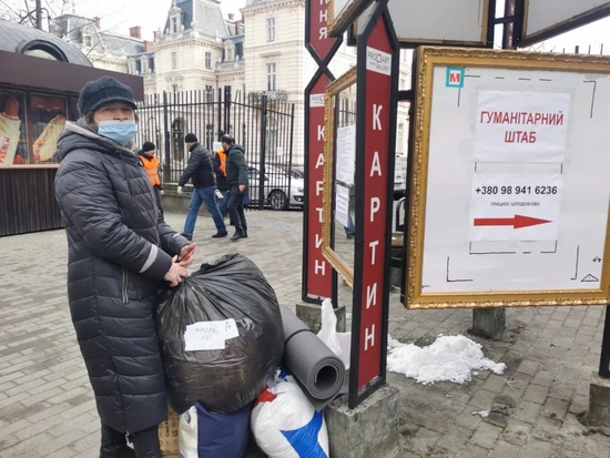 3月1日,一名女子在乌克兰利沃夫的一处物资发放点领取生活用品。(新华社记者陈文仙摄)