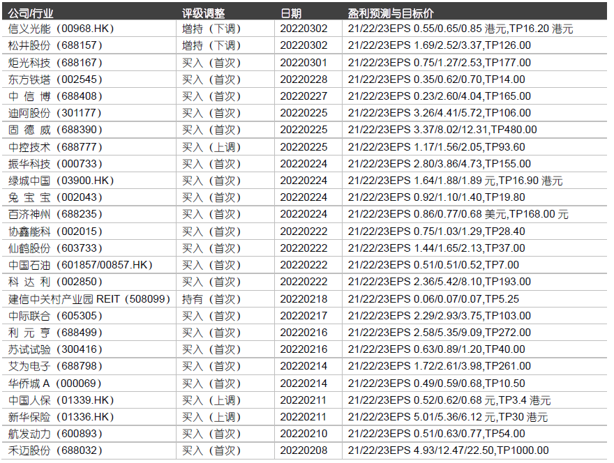 注:“评级调整”项下涉及的内容均节选自已经公开发布的证券研究报告(标示的日期为相关证券研究报告发布的时间),仅供汇总参考之用。若无特别说明,单位为人民币元