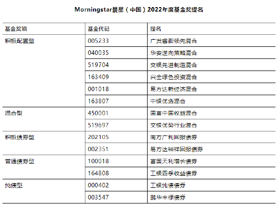 晨星(中国)2022年度基金奖提名名单如下,正式获奖名单预计将于3月30日颁布。