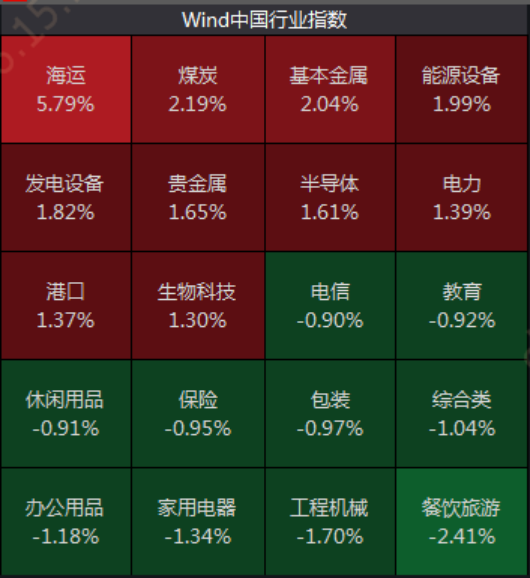 另一边,受益于海运、煤炭、金属及能源设备等板块拉升,创业板上午波动较大,下午震荡上行,截至收盘上涨0.89%。(数据来源:Wind)
