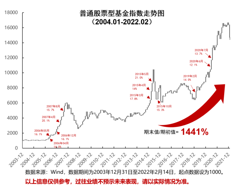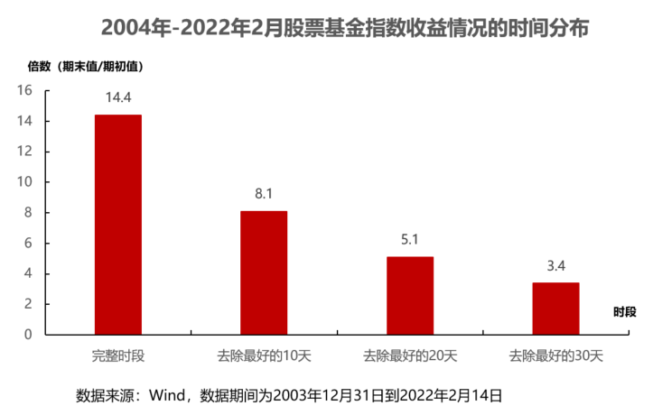 A股市场给了我们同样的回答:市场不会爬行,只会跳跃。历史表明,漫长的股市关键时期往往只有几天。一旦错过涨幅最大的那几天,总收益率往往就会大幅降低。回看中证500指数,2003年12月31日至2022年2月14日期间,年化11.5%的收益率并非在每年均匀实现。从2004年以来的A股市场普通股票型基金指数走势图来看,如果去除掉这18年里收益最好的30天,我们会发现股票型基金指数创造的回报只有3.4倍,不足完整时段创造回报的1/4。也就是说,如果在这关键的30天,您没有持仓的话,那么您的收益率可能会大幅下降。