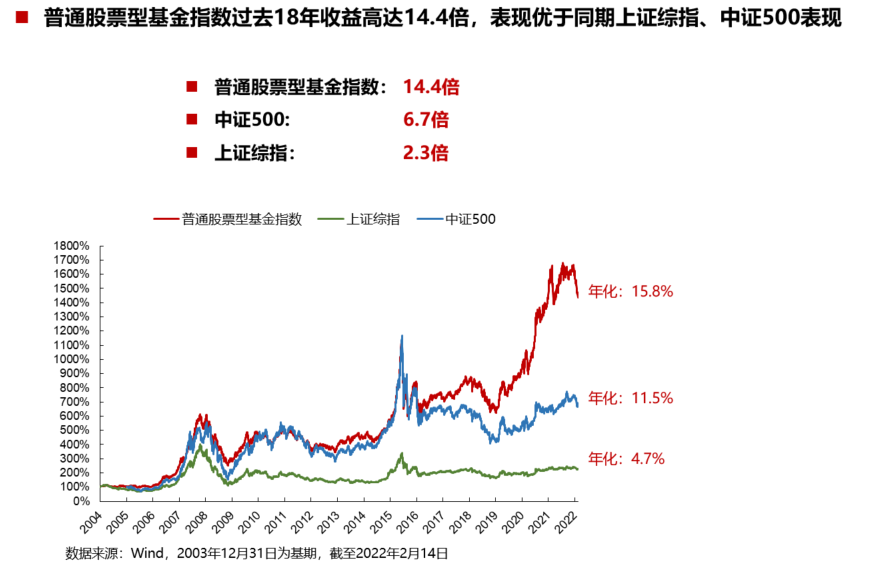 从2003年12月31日至2022年2月14日的18年间,中证500指数的回报是6.7倍,年化收益率为11.5%,而普通股票型基金指数的回报是14.4倍,年化收益率为15.8%。两者之间年化收益率4.3%的差额,大概就是全市场专业的基金公司、基金经理和资产管理机构所创造的超额回报。他们依托于专业的研究团队、丰富的信息来源、扎实的研究基础和严格的风控体系来力争战胜市场的宽基指数。将股票市场的麻烦交给专业团队,选择与自己投资价值观相符的基金经理,等待那关键的30天、3年。