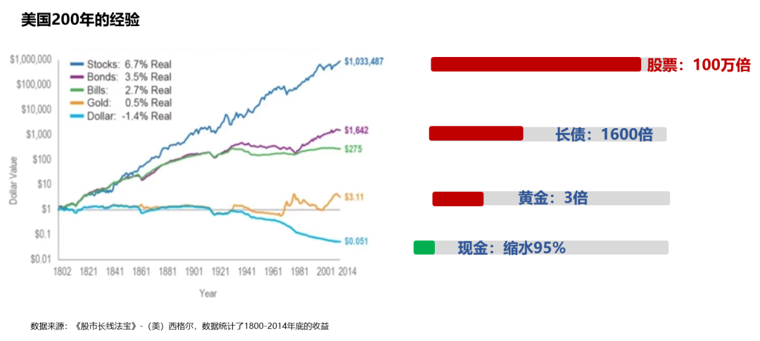 把视角放长,当我们回看美国过去200年的历史,会得出更明显的结论。西格尔在《股市长线法宝》中统计了美国市场1800年-2014年各类资产的收益。1800年的1美元,将其放在股票、长期债券、黄金和银行账户中的回报结果是迥然不同的。1800年股票市场中的1美元到2014年升值成100万美元,而银行账户中的1美元则缩水了95%仅相当于5美分。从美国市场200年的经验中,我们可以更加清晰地看到,股票型资产是长期抵抗购买力下降的优选姿势。
