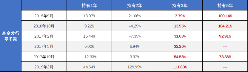 通过对比可以发现,从基金新发的寒冬期和火爆期分别持有不同时间,偏股混合型基金指数涨幅,1年、2年、3年、5年均出现明显差异,发行遇冷期间买入后的业绩表现要明显好于热销期间买入的结果,这也印证了市场的周期性属性。