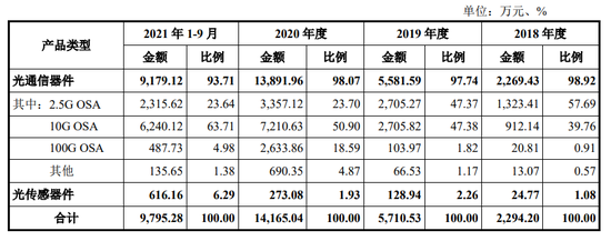 公司的主营产品可进一步细分为光通信器件产品和光传感器件产品,其中光通信器件产生的收入在公司主营业务收入中占比超过90%。公司目前主要客户为武汉联特、四川华拓、新易盛等波分复用光模块制造企业,国内前五名光模块企业中,新易盛为公司报告期内主要客户。