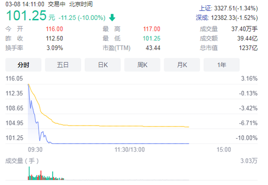 A股市场也被波及,华友钴业今日早盘闪崩跌停。盘面信息显示,钴镍业巨头华友钴业高开逾3%,交易不到半个小时,股价便跌停,报101.25元,总市值1237亿元。