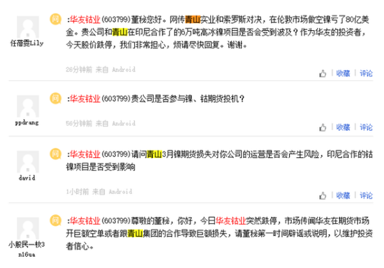 在互动平台上,至少有8位投资者就相关问题进行提问,有投资者提问称“请董秘第一时间辟谣或说明,以维护投资者信心”,有投资者提问称“贵公司和青山在印尼合作了的6万吨高冰镍项目是否会受到波及?”。