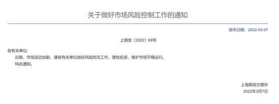 由于行情波动加剧,上期所3月7日晚间发文提示市场各方做好风控。上期所表示,近期,市场波动加剧,请各有关单位做好风险防范工作,理性投资,维护市场平稳运行。