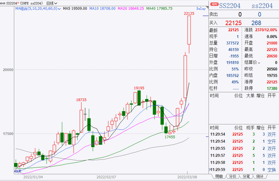 目前,镍的下游之中,不锈钢用得多。国内不锈钢(SS)主力合约触及涨停,涨幅12%。