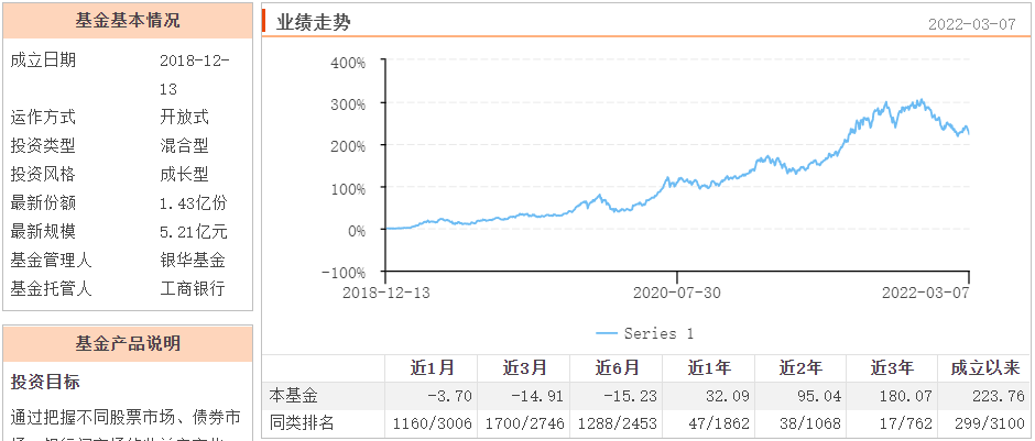 该基金成立于2018年12月,成立3年多来,累计总回报达到223.76%,年化回报高达43.82%。