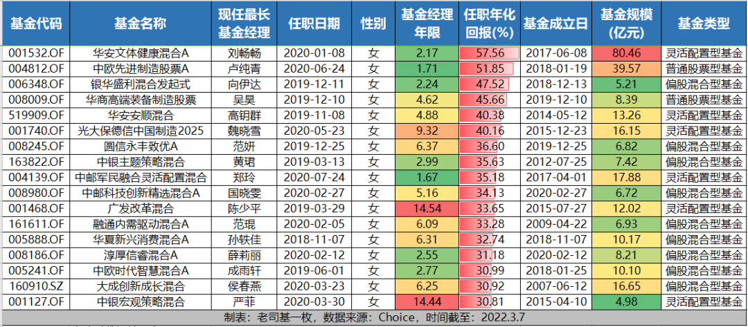 老司基今天也应个景,为大家盘点一下主动权益江湖中,那些任职年化收益居前的巾帼英雄们。