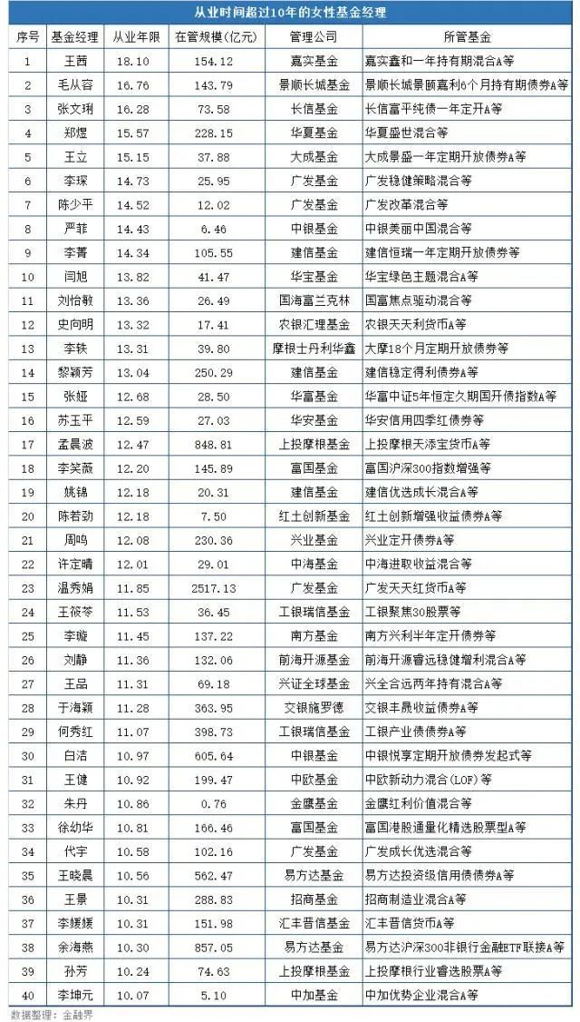 就从业时间来看,超10年的基金经理达到共计40位,嘉实基金王茜从业时间最长。
