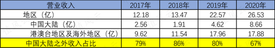 2017年以来,收入是以中国大陆之外为主,但这几年国内业务也发展很快,收入占比在上升。
