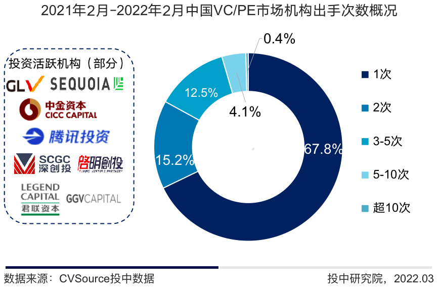 2022年2月,共有472家机构参与VC/PE投资,其中超三成机构出手次数在两次以上(含),主要的活跃机构有高瓴创投、红杉中国、中金资本、腾讯投资等。