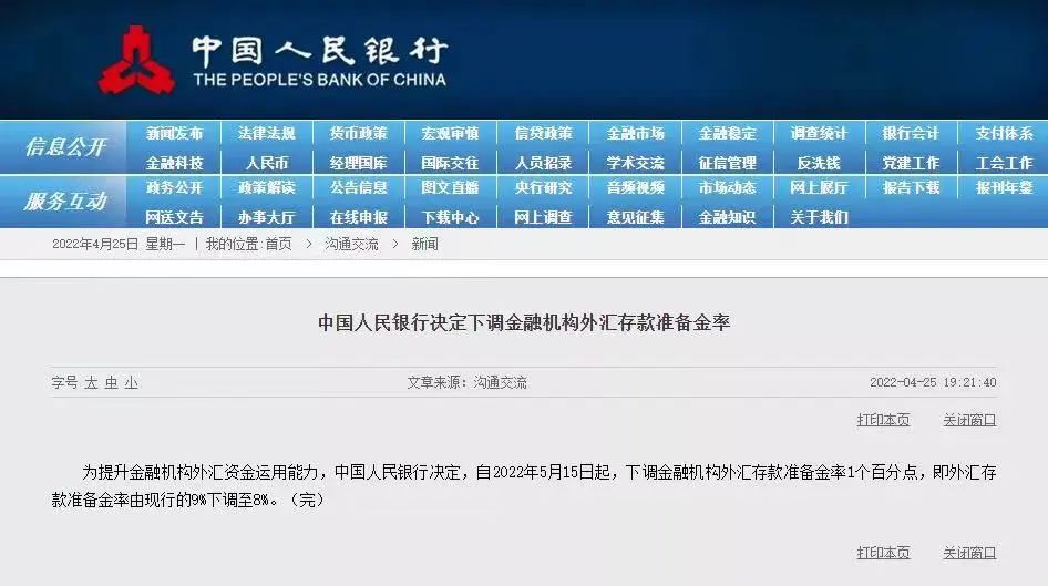 4月25日19时21分左右,中国人民银行发布消息称,为提升金融机构外汇资金运用能力,中国人民银行决定,自2022年5月15日起,下调金融机构外汇存款准备金率1个百分点,即外汇存款准备金率由现行的9%下调至8%。