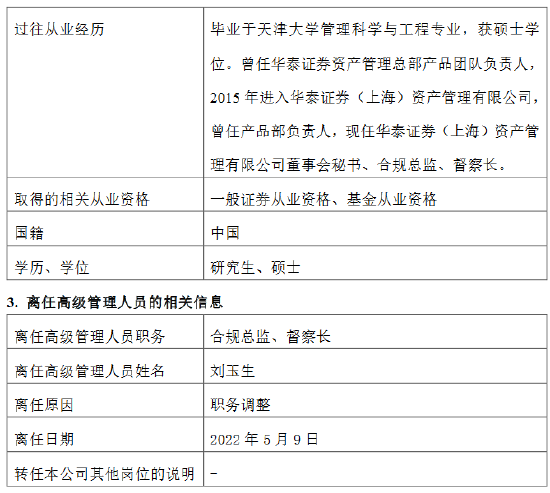 5月10日,华泰证券(上海)资产管理有限公司关于高级管理人员变更的公告,刘玉生因职务调整离任合规总监、督察长,新任刘博文为合规总监、督察长,任职日期2022 年 5 月 9 日。