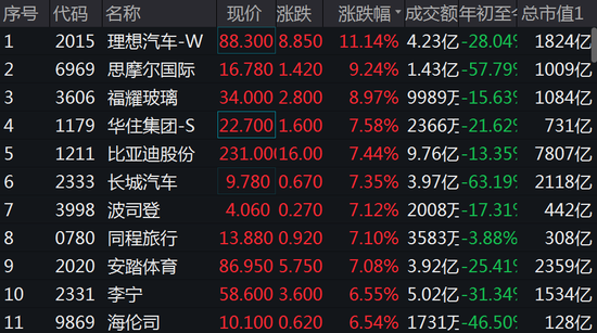 消费股集体爆发,理想汽车涨11%,思摩尔国际涨9%,华住集团、比亚迪、长城汽车、波司登、安踏体育等涨超7%。