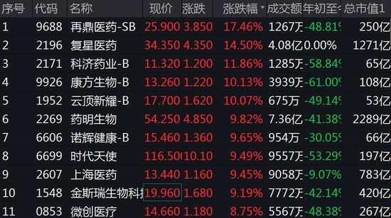 医药股上演大爆发,再鼎医药涨超17%,复星医药涨近15%,可济药业、康方生物、云顶新耀涨超10%,药明生物涨10%。